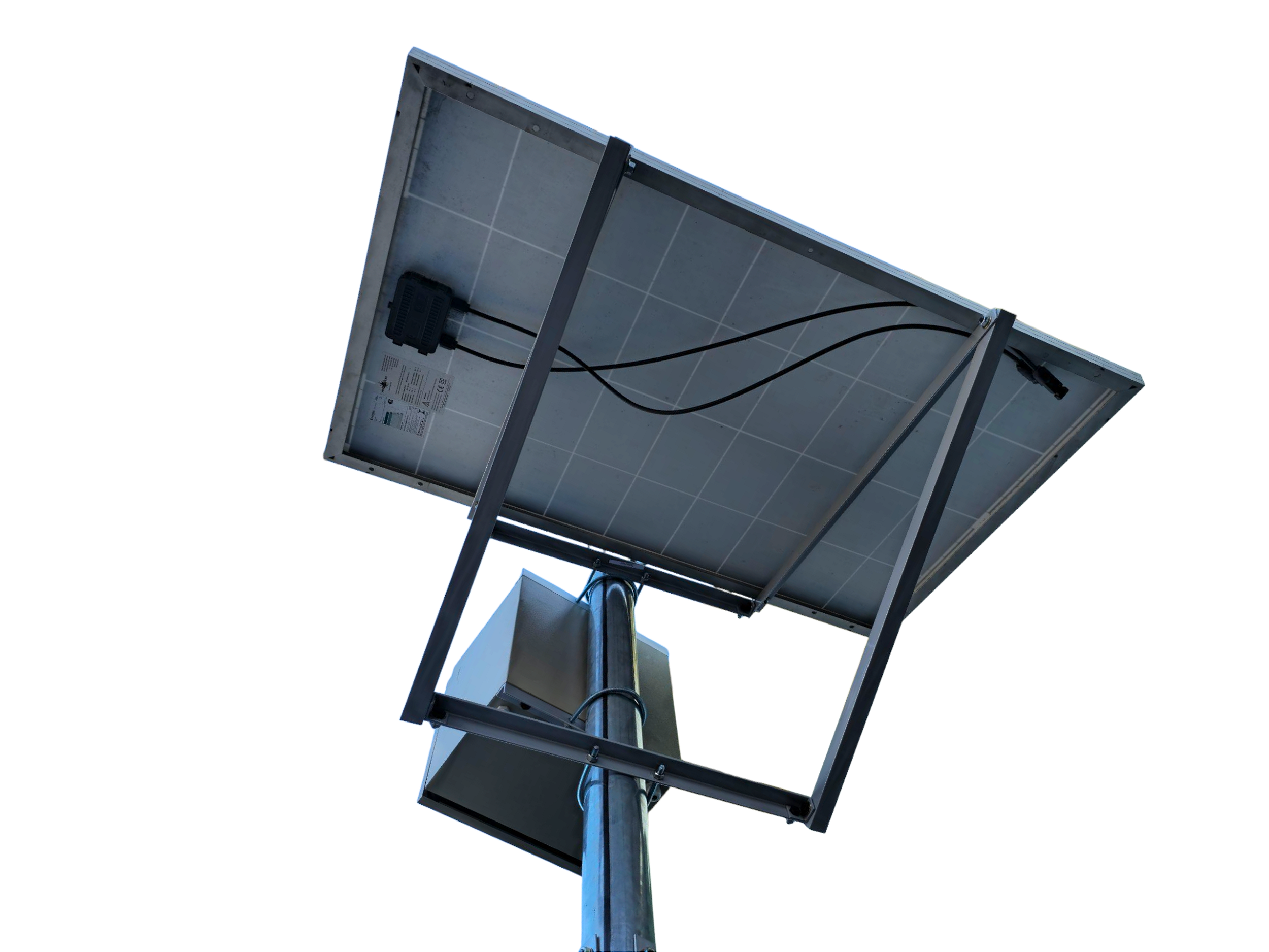 Montagem lateral em postes, com ajuste de ângulo de inclinação e orientação do painel;